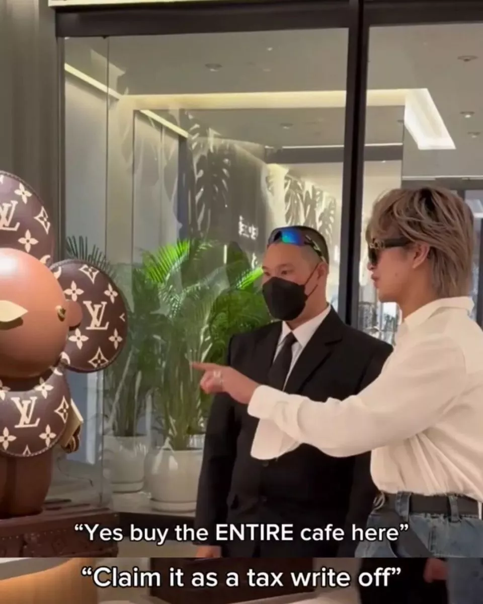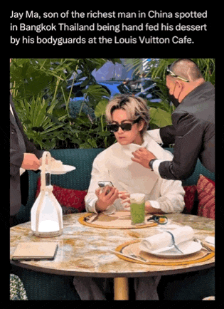 在这段视频里,一位名叫Jay Ma的富二代,被两个大汉保镖抬进LV店里,一位负责帮他围好餐巾,一位负责投喂小蛋糕。