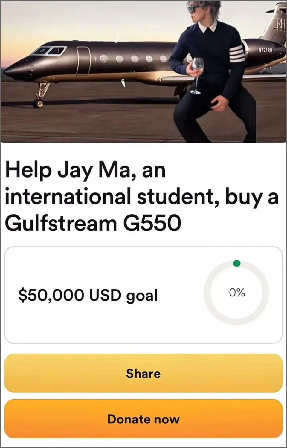 杰马在国外“滴水筹”发起筹款,为自己买一架私人飞机,原因是他最近被老父亲断了开支,“囚禁”在苏州,要偷偷逃到纽约去。