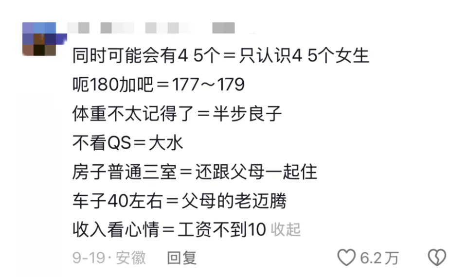 这位男士强调,自己的择偶要求是“三观必须如同小孔成像般一致”,因为上一段恋爱三观不合所以告吹。网友再次在一秒钟之内做出了这段话的阅读理解:价值观不同,意思是结婚拒绝给彩礼,想空手套白狼,结果对方不愿意。
