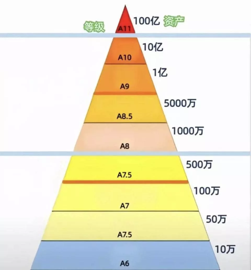 A代表资产(Asset),指个人或家庭的净资产(总资产减去总负债)。数字代表这个净资产的位数,单位是人民币(专题)。A8也就是净资产千万级别,A8.5即家庭净资产五千万元。