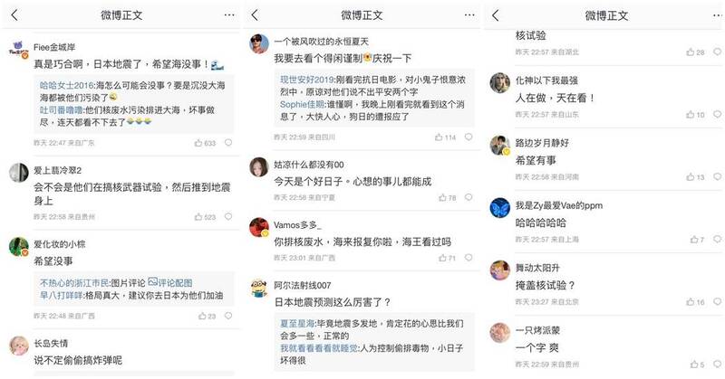 消息刚曝光没多久,「日本近海强震」随即登上微博热搜,大批小粉红幸灾乐祸,「希望海没事」、「希望有事」、「我要去看得閒谨制(抗日电影),对小鬼子恨意浓烈中,原谅对他们说不出平安两个字」、「谁懂阿,晚上看到这个消息大快人心,狗日的遭报应了」、「今天是个好日子」、「人在做,天在看」。