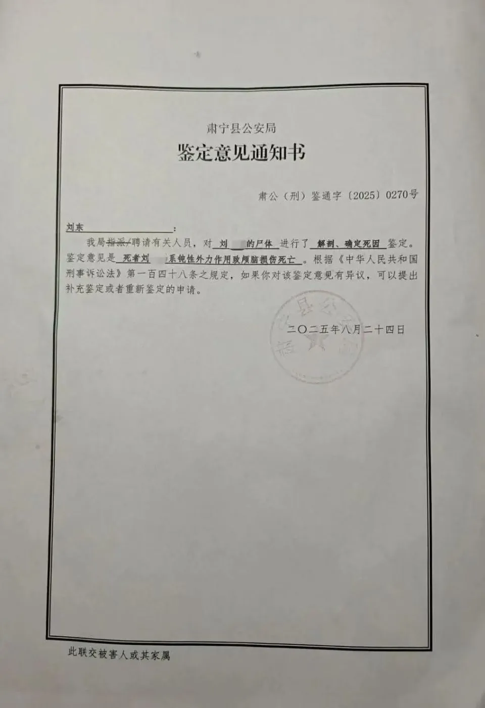肃宁县公安局于8月24日出具的鉴定意见通知书显示,该局聘请有关人员,对刘某某的尸体进行了解剖、死因鉴定。鉴定意见是死者刘某某系钝性外力作用致颅脑损伤死亡。