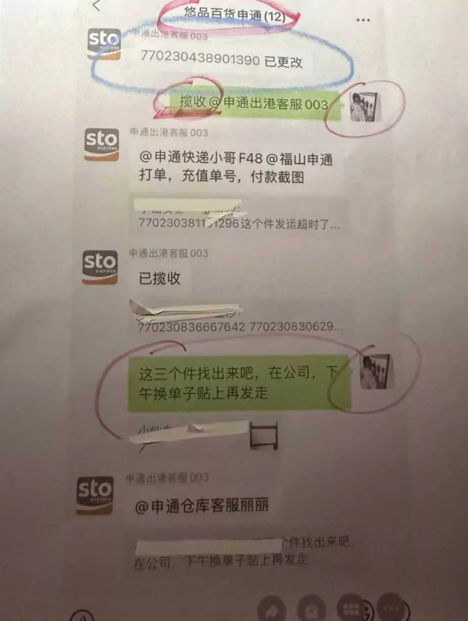 时女士说,本来她不打算再对此事件进行任何评论,一切等警方的处理结果。但她忽然收到粉丝发来的一张非常有力的证据,非常确凿地证明了她的想法。证据是一张群名为“悠品百货申通”的12人微信群聊天截图,内容显示,有客户要求“把这三个件找出来,下午换单子贴上再发走。”等内容。