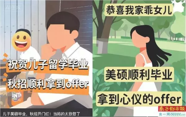 晚上十点半赵欣睡不着,今年刚从海外留学回国的她还没有找到工作,焦虑之余,她刷到了一条帖子。屏幕里,一个男孩笑容灿烂,手捧毕业证书身穿毕业服。“恭喜儿子秋招逆袭!”配文写道,“儿子是英国杜伦大学市场营销硕士,现在拿到了字节offer,终于不用担心没班上了”。评论区一片羡慕,而仔细阅读发帖者内容后会发现,文中总是不经意地提到一家“宝藏求职机构”。今年秋招季,这类“晒成功”的“学生家长”账号在社交媒体频频出现,南都大数据研究院记者调查发现,这些“家长”都通过私信推荐了几家秋招机构,其标价从1万元到8万元不等。“这是AI生成的假内容,配合伪造的家长身份,目的是引流到收费机构。”留学行业资深顾问郑杨接受记者采访时揭开了这个骗局。