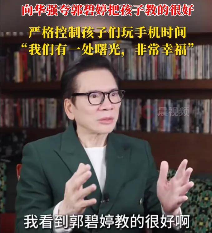 但向华强这个公公却十分认可郭碧婷的能力,说她把孩子教的很好,尤其是小孩子玩手机,让放下就放下,很有规矩。还爆料郭碧婷出去工作两三天,回来之后就会非常重视两个孩子,甚至把孙辈比作“曙光”。