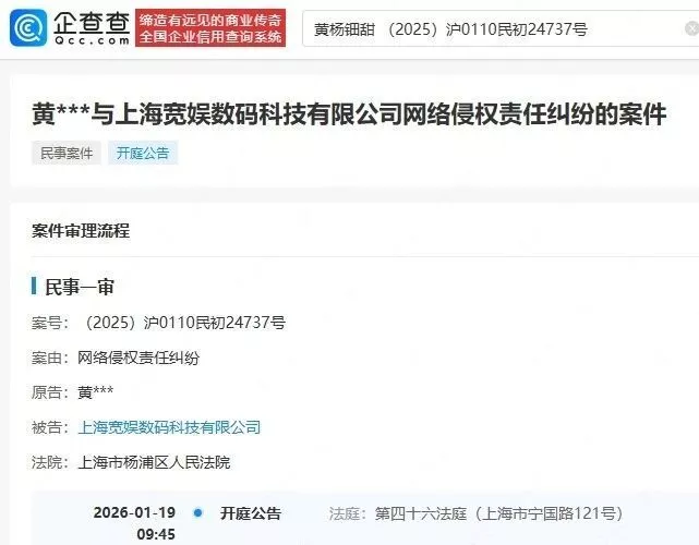 据@北青娱见12月9日消息,企查查APP显示近日新增开庭公告一则,黄杨钿甜起诉B站运营主体——上海宽娱数码科技有限公司网络侵权责任纠纷案计划将于2026年1月19日开庭审理。