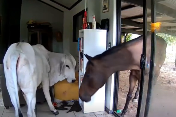 【主人不在家 宠物开派对】澳大利亚北领地议员安德鲁·麦凯在外用餐时,通过家中摄像头惊见他的两只狗把门打开,让院子里的牛和马大摇大摆地进了屋,它们玩耍了一个半小时,推倒了架子上的东西,吃了鸡饲料,甚至还喝了鱼缸里的水。不过还算克制,没有造成严重损失。