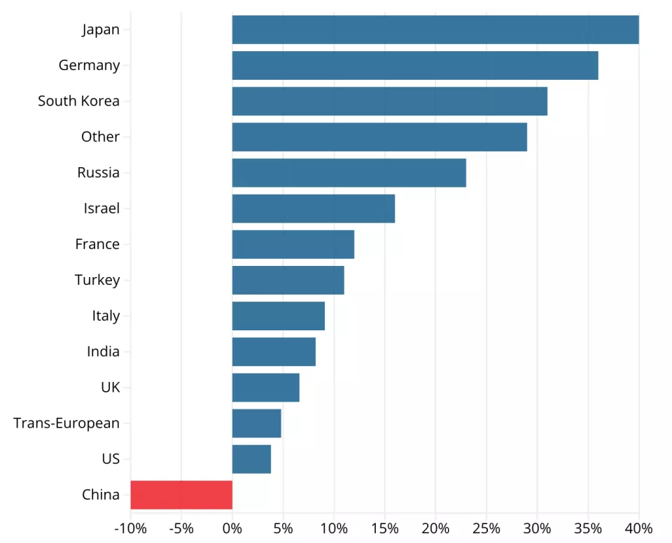 四家总部位于德国的公司也进入了百强榜单。总体而言,它们的武器收入增长了36%,达到149亿美元。
