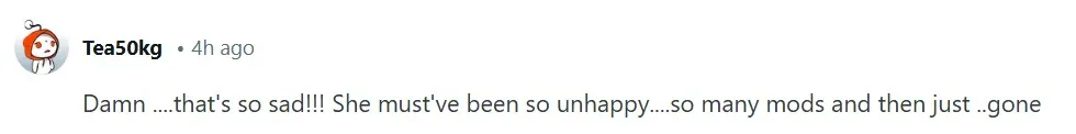 “天哪……太让人难过了!!她一定过得很不开心……做了这么多整形手术,然后就这么……离开了。”