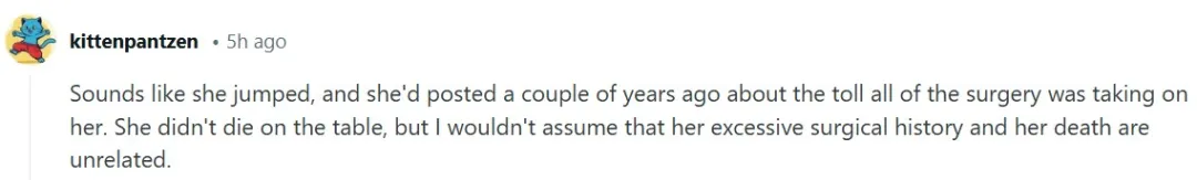 “感觉她是自己跳下去的,她几年前就发帖讲过所有手术给她造成的影响。她并非死在手术台上,但我觉得过度整形和她的死是有关联的。”