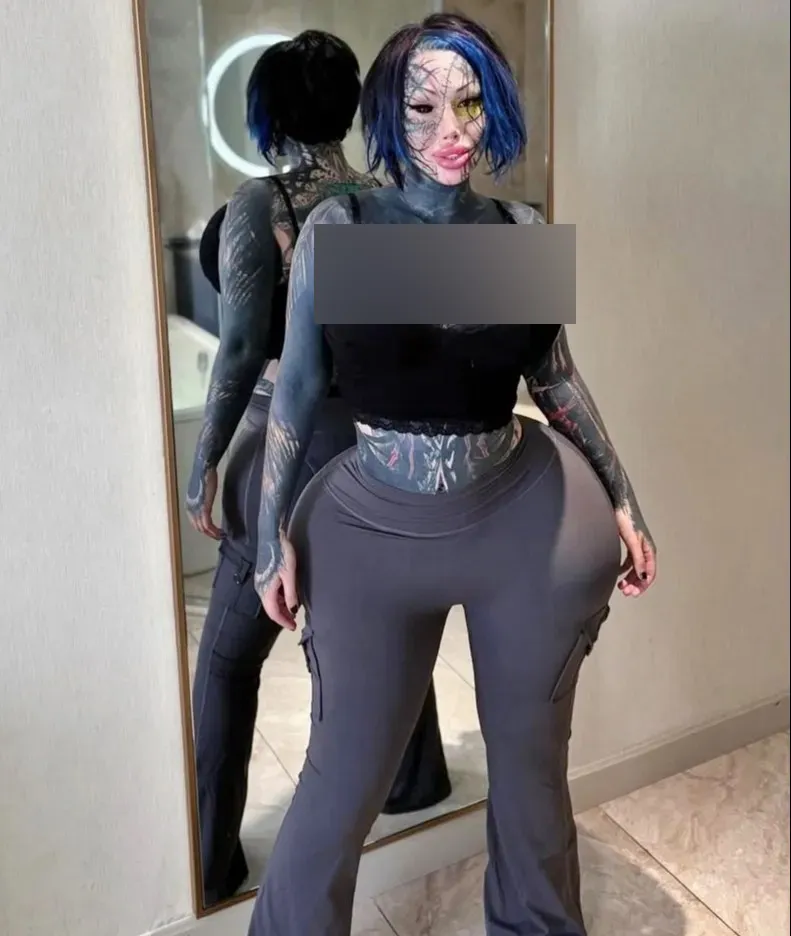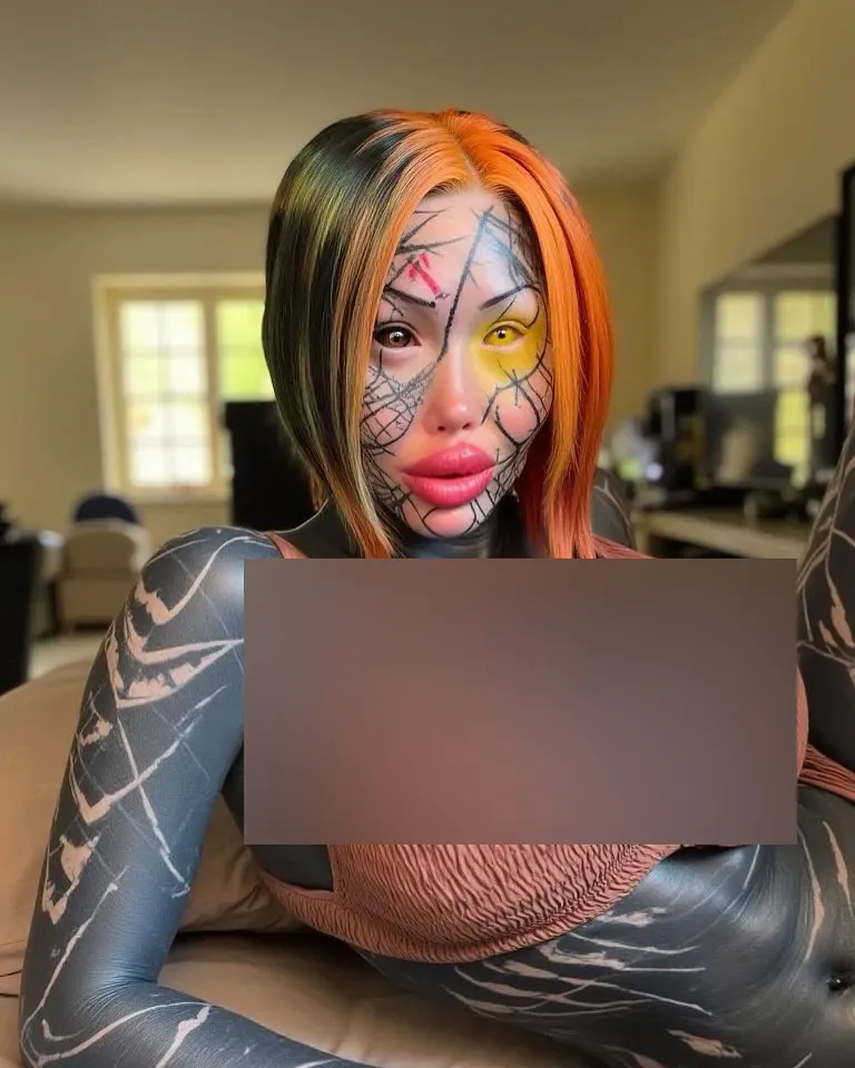 她终于肯取出胸部假体,还计划把脸颊和嘴唇的填充物也都溶解掉,可还没等彻底回归自然,去年,她又忍不住开始了新一轮的极端改造,把自己整个上半身都纹满了黑色……