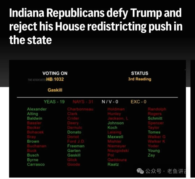 令外界非常诧异,也让川普很恼火的是,在印地安纳州的参议会里,共和党占据了40席,民主党仅有10席。对川普的方案,即使民主党人全部投了反对票的,也本来是无法改变最终结果的。但离谱的是,居然有28个共和党议员也站在了民主党一边,投票反对了川普的方案!