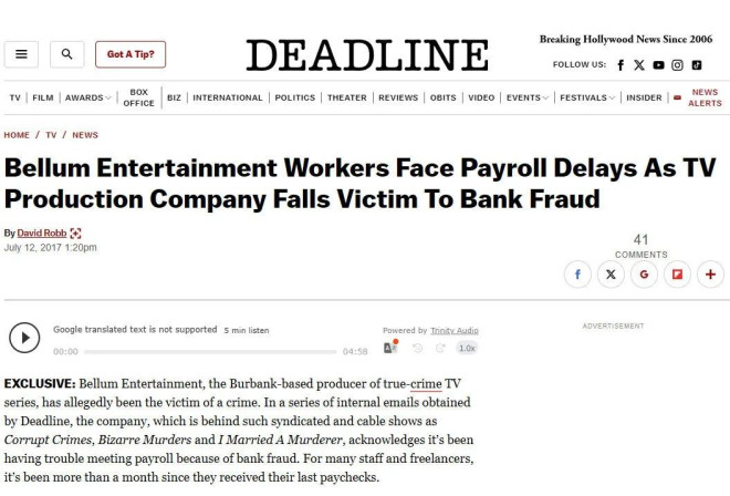 2017年6月,麦克唐纳向员工们撒了一个谎,说公司之所以发不出工资,是因为遭遇了严重的银行诈骗,当时业内杂志《Deadline》还为这事儿写了篇独家报道。