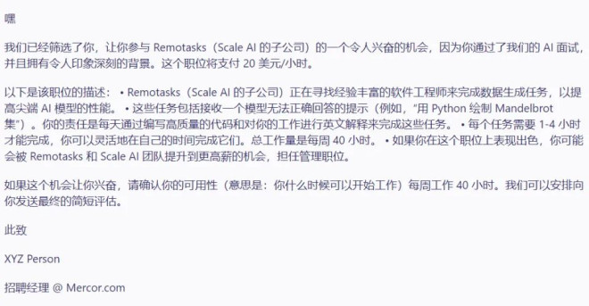 有人被面试官疯狂放鸽子;有人收到了Offer,结果发现发件人的领英是假的,查无此人;甚至有个老哥,才工作了9个月,愣是被Mercor评定为“全球顶尖人才”,进入了所谓的“前1%人才池”。