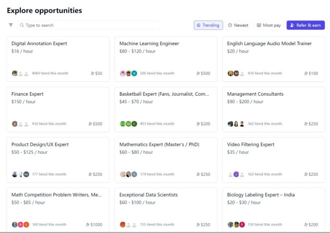 ▲Mercor平台的任务售价16~100+美元/时,一天大约工作几个小时不等。