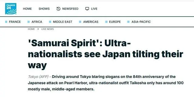 在一篇12月12日刊登的标题为《“武士精神”:极端民族主义者认为日本正朝着他们的方向倾斜》的报道中,法新社采访了一个名为“大行社”的日本极右翼团体。