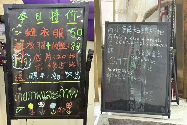 她工作的门店,年轻店员多,好几位都会英语,只有自己也是在外地工作几年之后,回到镇上转行做化妆师。门店里有个女孩脑筋活络,专门做了一个小黑板,画了个招揽外国人的海报,用英语和泰文写上大大的“旅拍”。