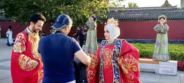 在社交平台上,外国人体验古风写真,也早已成为流量密码。博主“大秦列颠田冰冰”带着她的英国老公,到西安拍了一套。和常规模式不同,她的光头老公戴上了假发,扮成贵妃,她自己则扮成了王爷,贴上了胡子。两个人顶着这身装扮吃包子、逛街、去博物馆看文物,不管是在线上还是线下,始终是人群的焦点。
