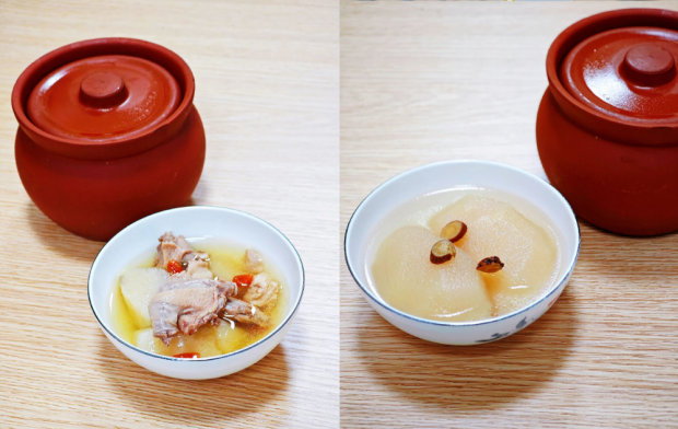 从左到右分别是鸽肉山药汤、甘草雪梨汤。/图源:成都市第二人民医院官微