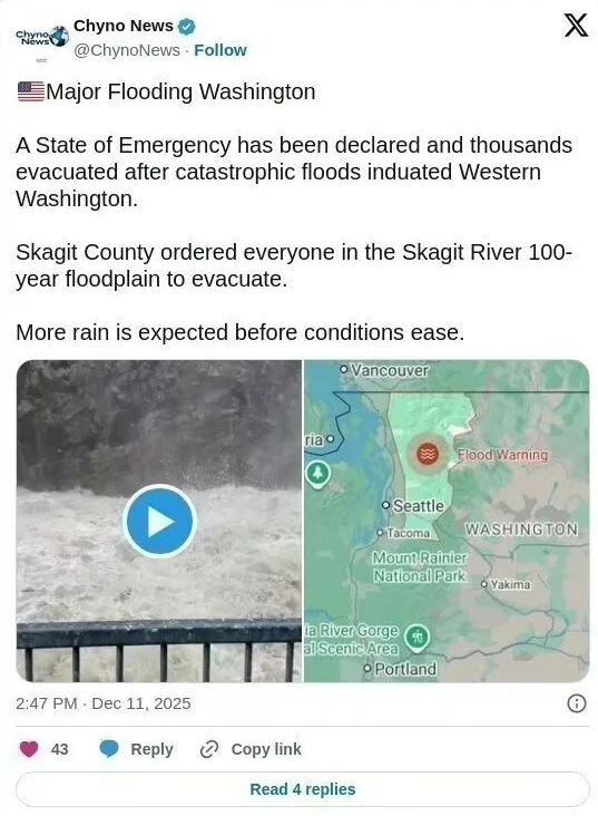 “我们需要联邦政府批准这项请求。情况极其严峻,未来几天至关重要。我呼吁所有华盛顿州居民密切关注所在县和应急管理部门发布的警报”。