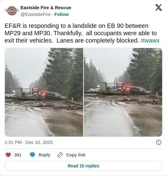 气象部门表示,目前已发生多起山体滑坡。周三下午, 90号州际公路东行方向部分路段因山体滑坡而完全封闭。