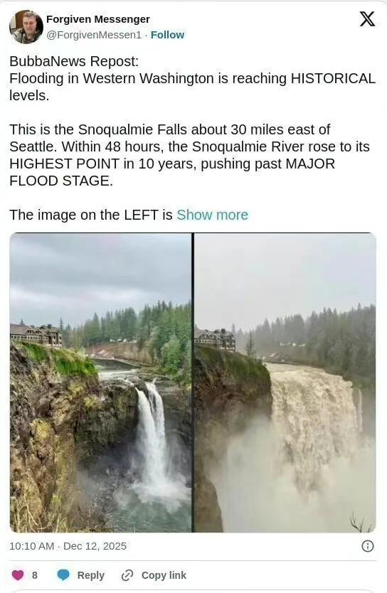 想要感受洪灾有多厉害,看看华盛顿州的名胜景点斯诺夸尔米瀑布(Snoqualmie Falls)。