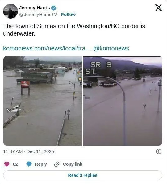 由于大部分洪水来自华盛顿州的努克萨克河(Nooksack River),萨马斯-亨廷顿边境口岸仍然关闭。