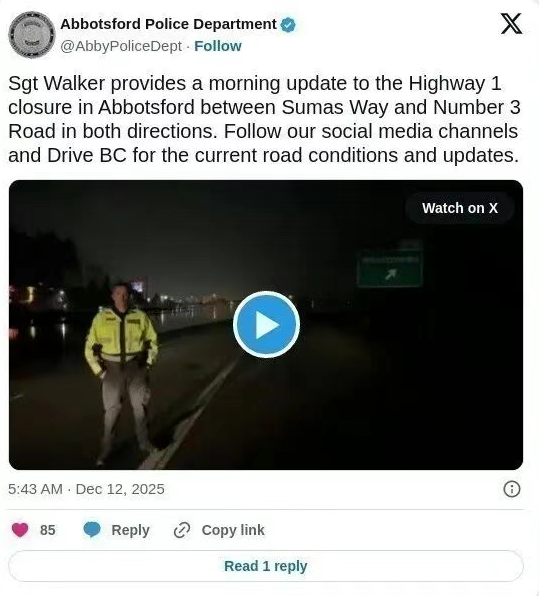 由于洪水,BC交通运输厅关闭了从阿伯茨福德的萨马斯路(11号公路)到奇利瓦克的3号路的1号高速公路。