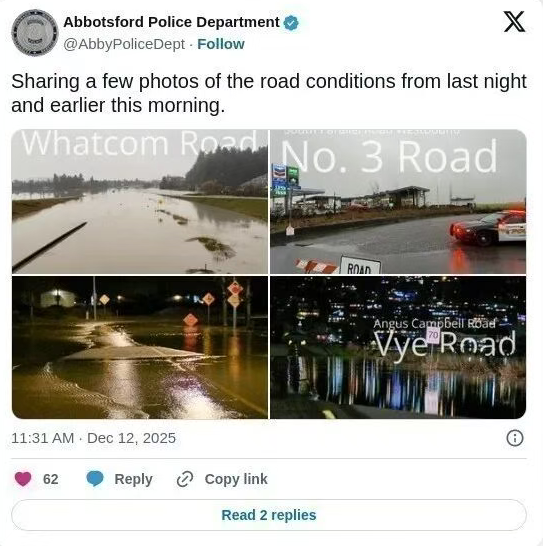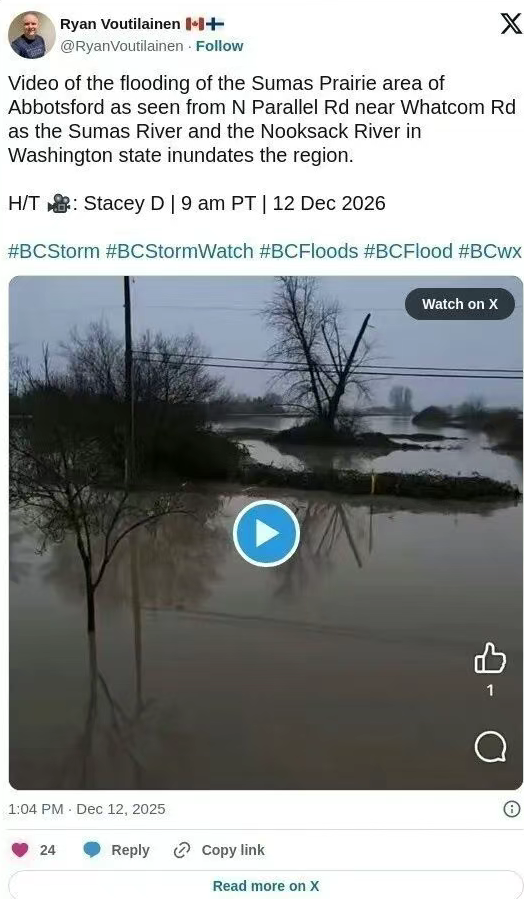 阿伯茨福德(Abbotsford)一些地区变成一片泽国,阿伯茨福德市府在昨天下午的灾情通报中预测灾情应该不会有2021年那么严重,但实际情况比2021年更加惨重。