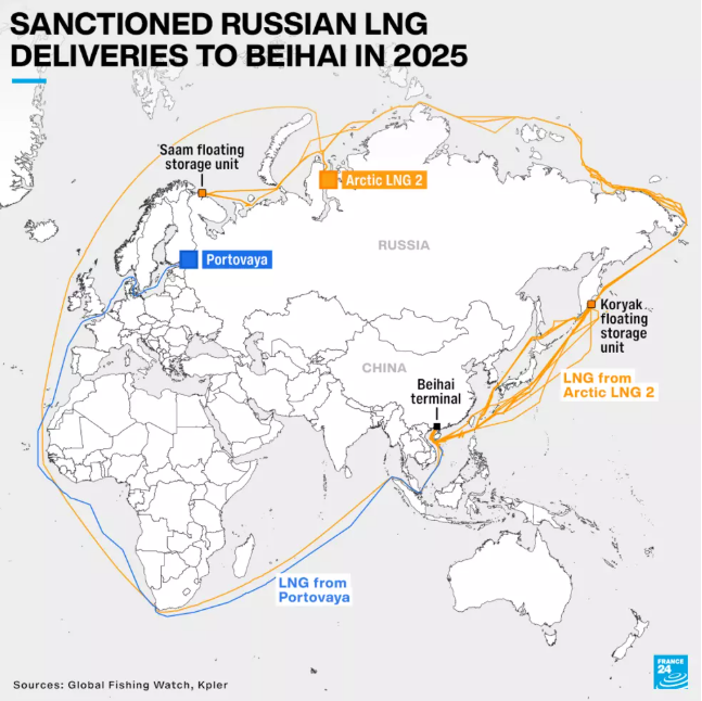 在美欧对俄罗斯能源制裁持续收紧的背景下,受制裁的俄罗斯液化天然气(LNG)正以前所未有的规模、且几乎“公开透明”的方式运抵中国。最新船舶追踪数据与卫星影像显示,短短数月内,超过100万吨来自受制裁项目的俄罗斯LNG已通过中国北海港进入中国市场,中俄能源合作在制裁环境下出现显著变化,也引发外界对全球能源秩序与制裁执行力的高度关注。