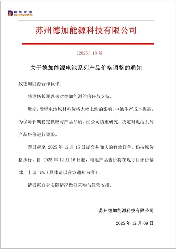 德加能源9日也发布了《关于德加能源电池系列产品价格调整的公告》称决定对电池系列产品售价进行调整,自2025年12月16日起,电池产品售价将在现行目录价基础上调15%。